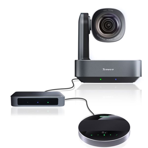 Hệ thống hội nghị truyền hình và âm thanh tất cả trong một Tenveo cho các phòng từ trung bình đến lớn. Gói giá cả phải chăng đi kèm với Zoom HD 12X và camera 4K, loa thu âm 360° với bán kính thu âm 6 mét.